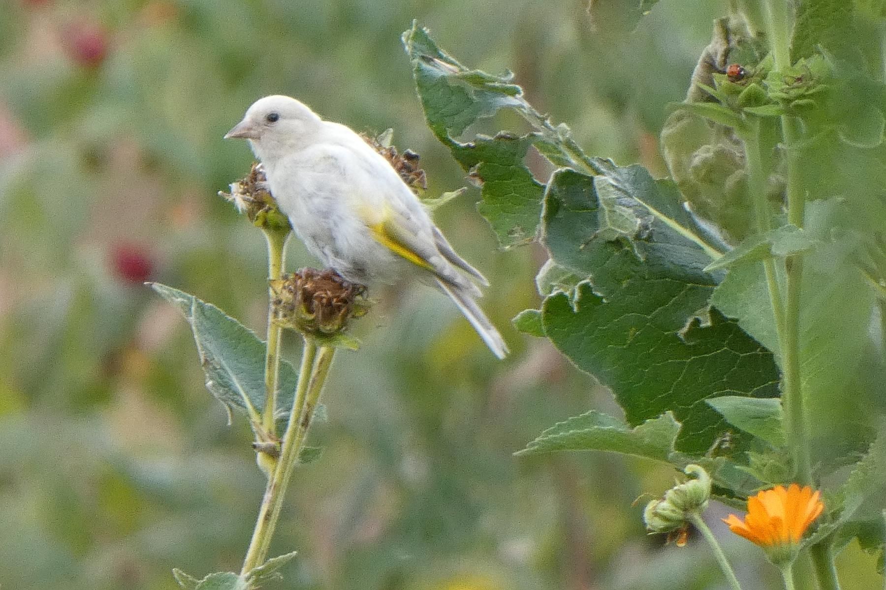 Leucism is the partial loss of pigmentation of a bird’s plumage (unlike albinism, which is complete loss of colour) and is a rare occurrence in the wild — so we were delighted to spot this leucistic goldfinch perched on our Elecampane (with many thanks to Gareth Pashley for the photo below).